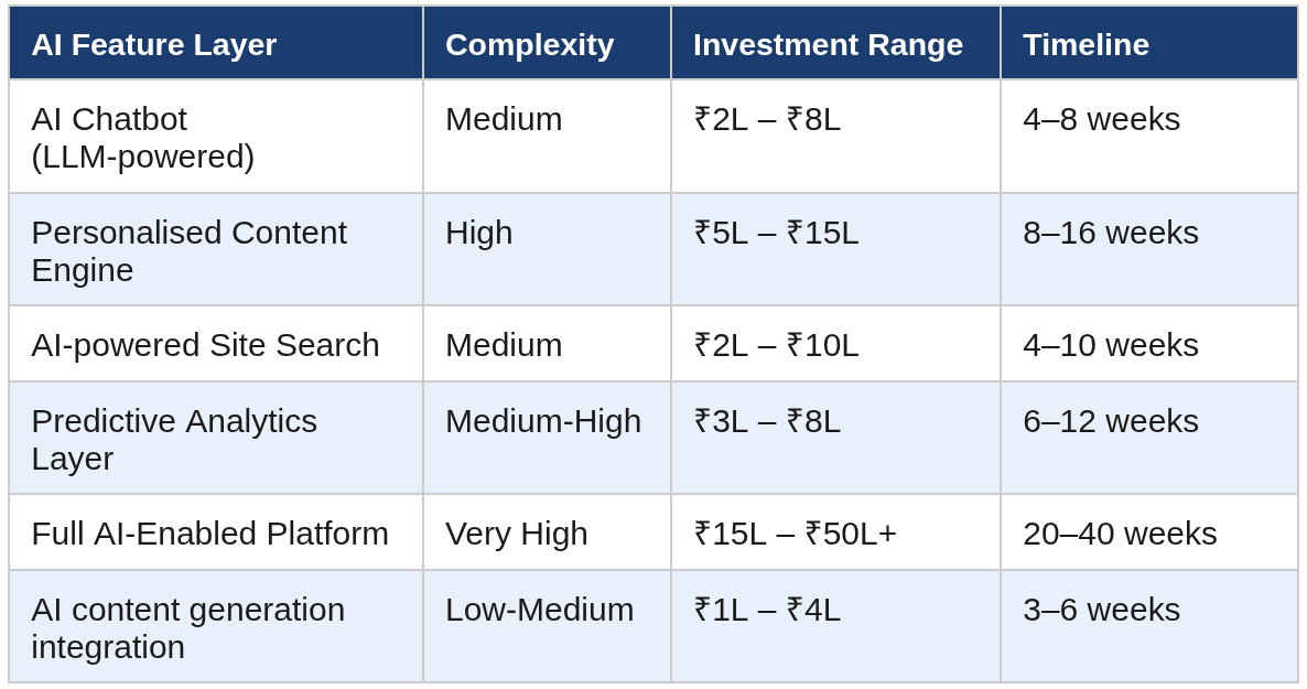 These are build costs. Running costs (LLM API calls, compute, analytics infrastructure) vary by usage volume — plan for ₹15,000-₹1,00,000/month depending on traffic and feature depth.