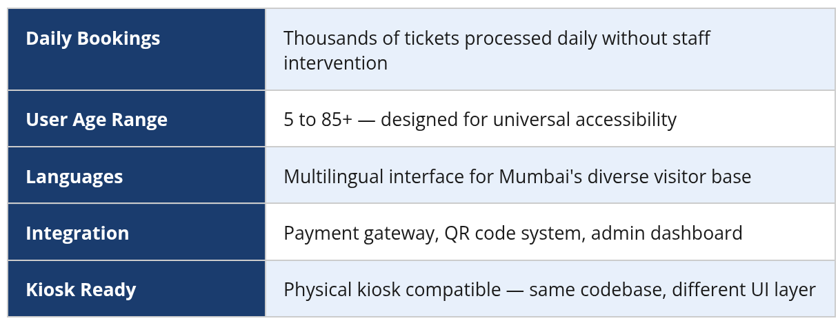 We've now delivered digital solutions for multiple government bodies — Mumbai Zoo, CSMVS Museum (kiosk ticketing), BMC Swimming Pools (booking system), and government enterprise clients like UPL. Each project taught us something that private sector clients rarely encounter: