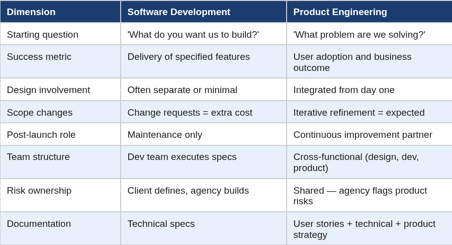 Software development delivers what you specify. Product engineering helps you figure out what to specify in the first place — and then builds it.